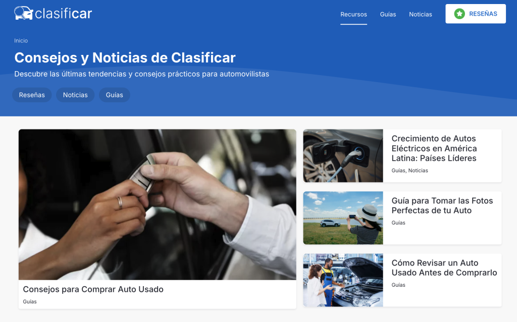 Clasificar también cuenta con una sección dedicada a artículos donde los usuarios pueden acceder a guías útiles, consejos para la compra y venta de vehículos, reseñas de autos, noticias del sector automotriz y mucho más.